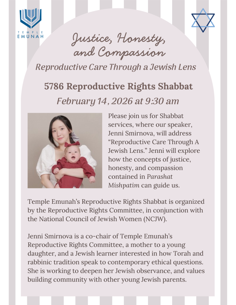 Please join us for Shabbat services, where our speaker, Jenni Smirnova, will address “Reproductive Care Through A Jewish Lens.” Jenni will explore how the concepts of justice, honesty, and compassion contained in Parashat Mishpatim can guide us.